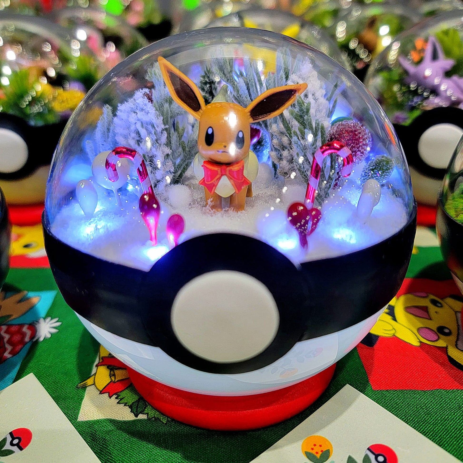 This terrarium features a festive Eevee in a snowy forest. Lights are included.